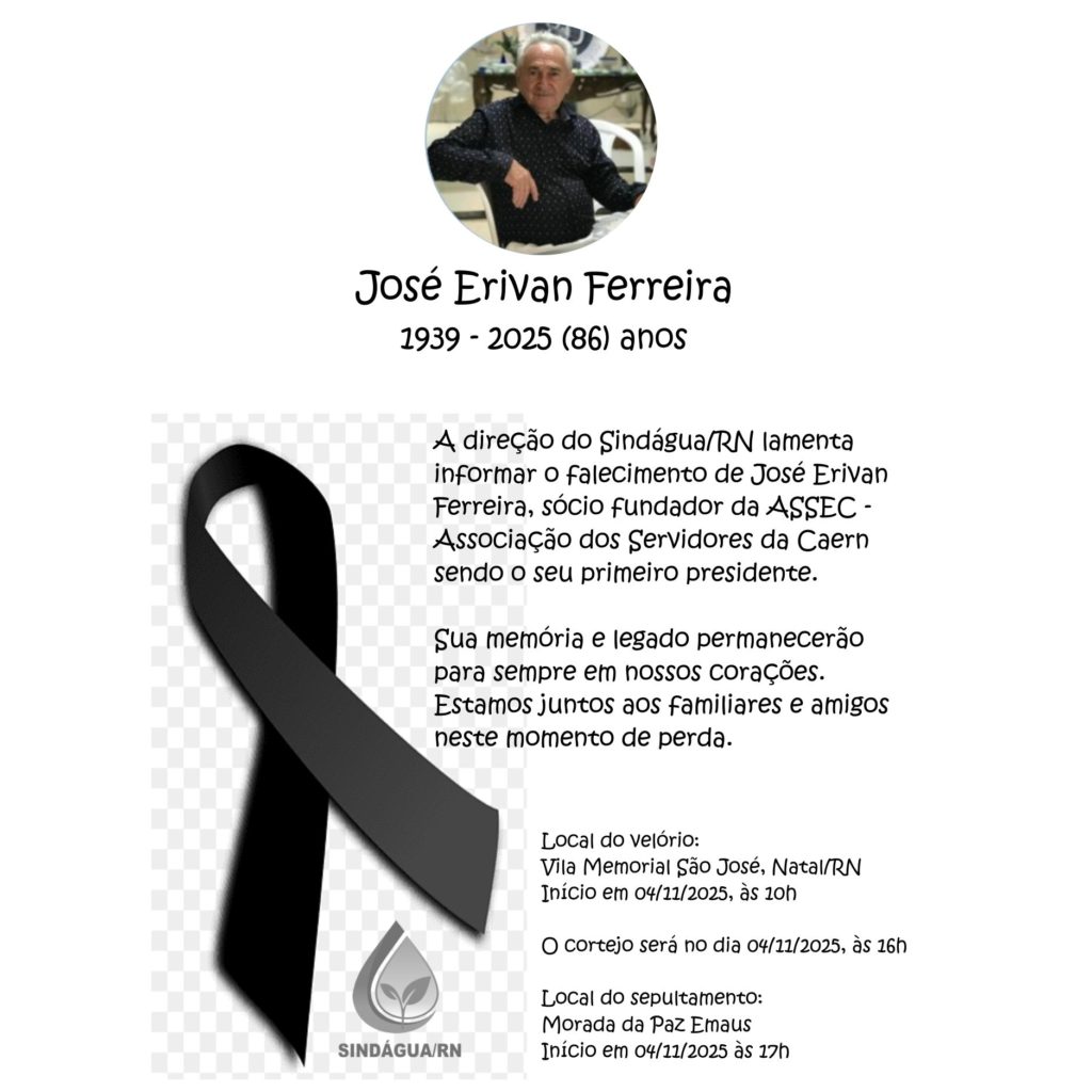 A direção do Sindágua/RN lamenta informar o falecimento de José Erivan Ferreira, sócio fundador da ASSEC – Associação dos Servidores da Caern sendo o seu primeiro presidente.