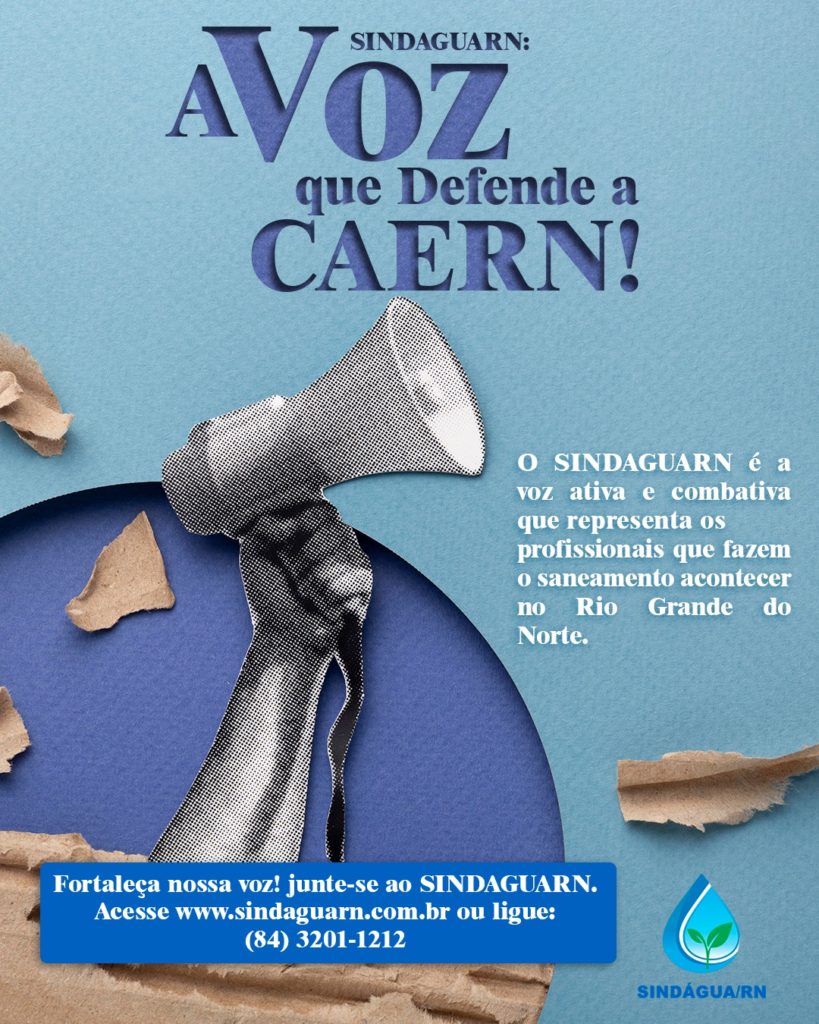 Quem conhece o dia a dia do saneamento no Rio Grande do Norte sabe: a CAERN é um patrimônio de todos nós. E para que ela continue sendo pública, eficiente e voltada para o bem-estar da população, é preciso uma voz que não se cale. O SINDAGUARN é essa voz! Representamos os profissionais que, faça chuva ou faça sol, garantem que a água chegue à sua casa e que o esgoto seja tratado com responsabilidade. Nossa luta é contra a privatização e contra qualquer iniciativa que coloque o lucro acima da saúde pública. Mas essa voz só é forte quando estamos unidos. Ao se juntar ao SINDAGUARN, você fortalece a defesa de um serviço essencial e garante que o futuro do saneamento no RN continue nas mãos do povo. Fortaleça nossa voz, junte-se a nós e vamos proteger o que é nosso!