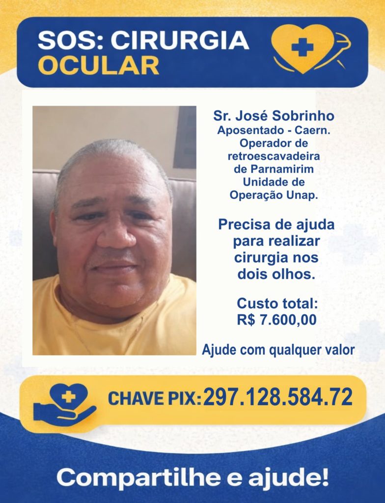 O Sr. José Sobrinho da Rocha Junior, aposentado da CAERN, precisa de cirurgia urgente nos dois olhos. O custo total é de R$ 7.600,00.