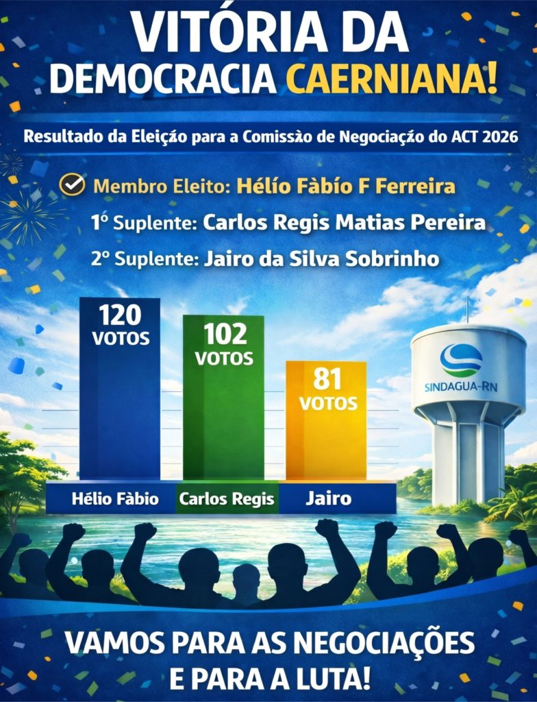 Com grande satisfação e orgulho, o Sindágua/RN anuncia o resultado da eleição para a Comissão de Negociação do Acordo Coletivo de Trabalho (ACT) 2026. Este processo democrático, que contou com a participação ativa da categoria, reafirma a força e a união dos trabalhadores caernianos na defesa de seus direitos e interesses.